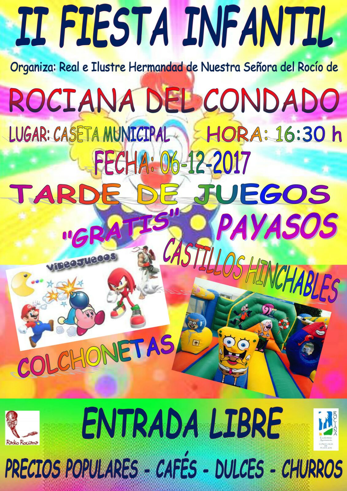 Así que desde estas líneas invitamos a todos los niños y niñas de Rociana el próximo día 6 de Diciembre, víspera de las deseadas Gamonitas, a que acudan a la Caseta Municipal a partir de las 16:30 horas a la II Fiesta Infantil que organiza la Real e Ilustre Hermandad del Rocío de Rociana. Del mismo modo que el año pasado contaremos con payasos, castillos hinchables, colchonetas y videojuegos. Todo ello conforma una oferta de ocio y diversión para los más pequeños que les hará pasar una tarde muy divertida en compañía de sus amigos. Y lo mejor de todo es que es una actividad COMPLETAMENTE GRATUITA para ellos. La Hermandad del Rocío de Rociana tiene el detalle de ofrecerles este regalo irrechazable.