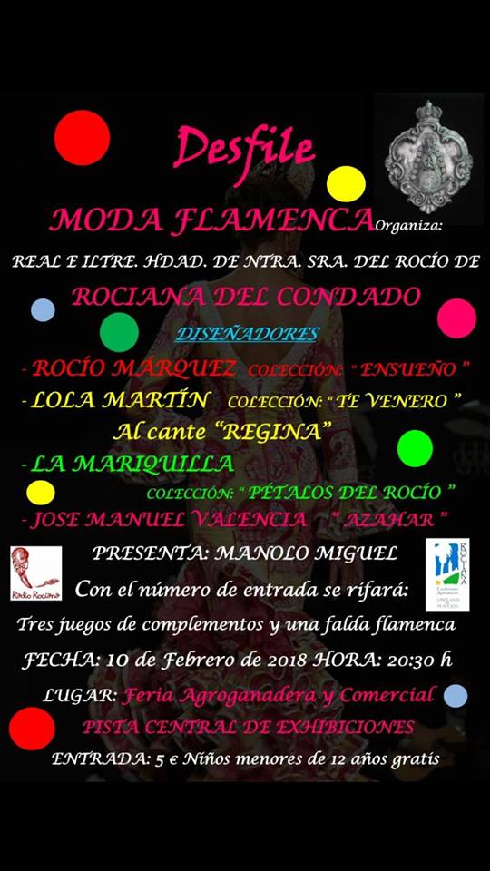 Y es en el marco que nos ofrece la Feria Agroganadera y Comercial donde se incrusta, desde hace ya un par de años, el tradicional Desfile de Moda Flamenca que la Hermandad del Rocío de Rociana del Condado organiza por estas fechas. Este desfile se lleva celebrando muchos años atrás, pero es justo reconocer que desde que forma parte de la programación oficial de la Feria ha ido creciendo y mejorando, a la vez que ha exigido de los organizadores un esfuerzo para dotar al mismo de la categoría suficiente como para ser merecedor de ocupar tan importante lugar en la programación de la Feria Agroganadera y Comercial. Desde aquí, una vez más, la Hermandad del Rocío de Rociana quiere agradecer públicamente al Ayuntamiento de Rociana las facilidades y la ayuda prestadas para celebrar nuestro evento en el día central de la Feria y en un emplazamiento tan importante.