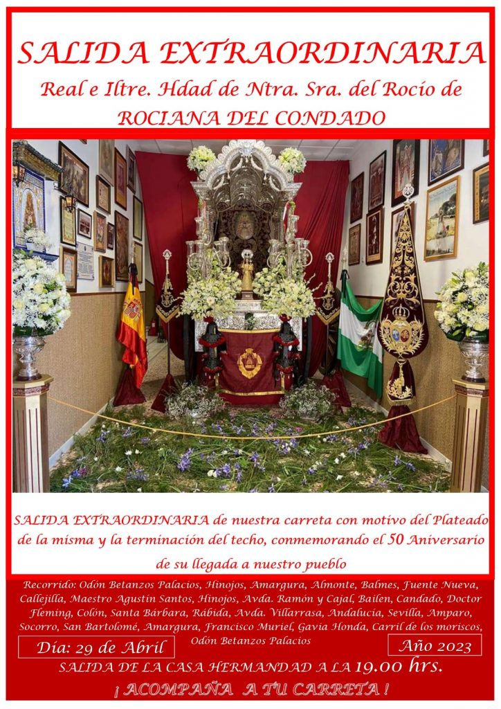 Hace ahora cincuenta años, la carreta de nuestra hermandad pisó por primera vez el pueblo de Rociana para uso y disfrute de todos los rocieros. Medio siglo después, lo sigue haciendo cada nueva primavera y este año, una vez acabados los trabajos de plateado y terminación del techo, lo hará de nuevo pero de manera extraordinaria. Será el sábado 29 de abril a las 19:00 h con salida desde nuestra casa de hermandad en la calle Odón Betanzos y con un itinerario que recorrerá calles por las que no suele pasar habitualmente.
